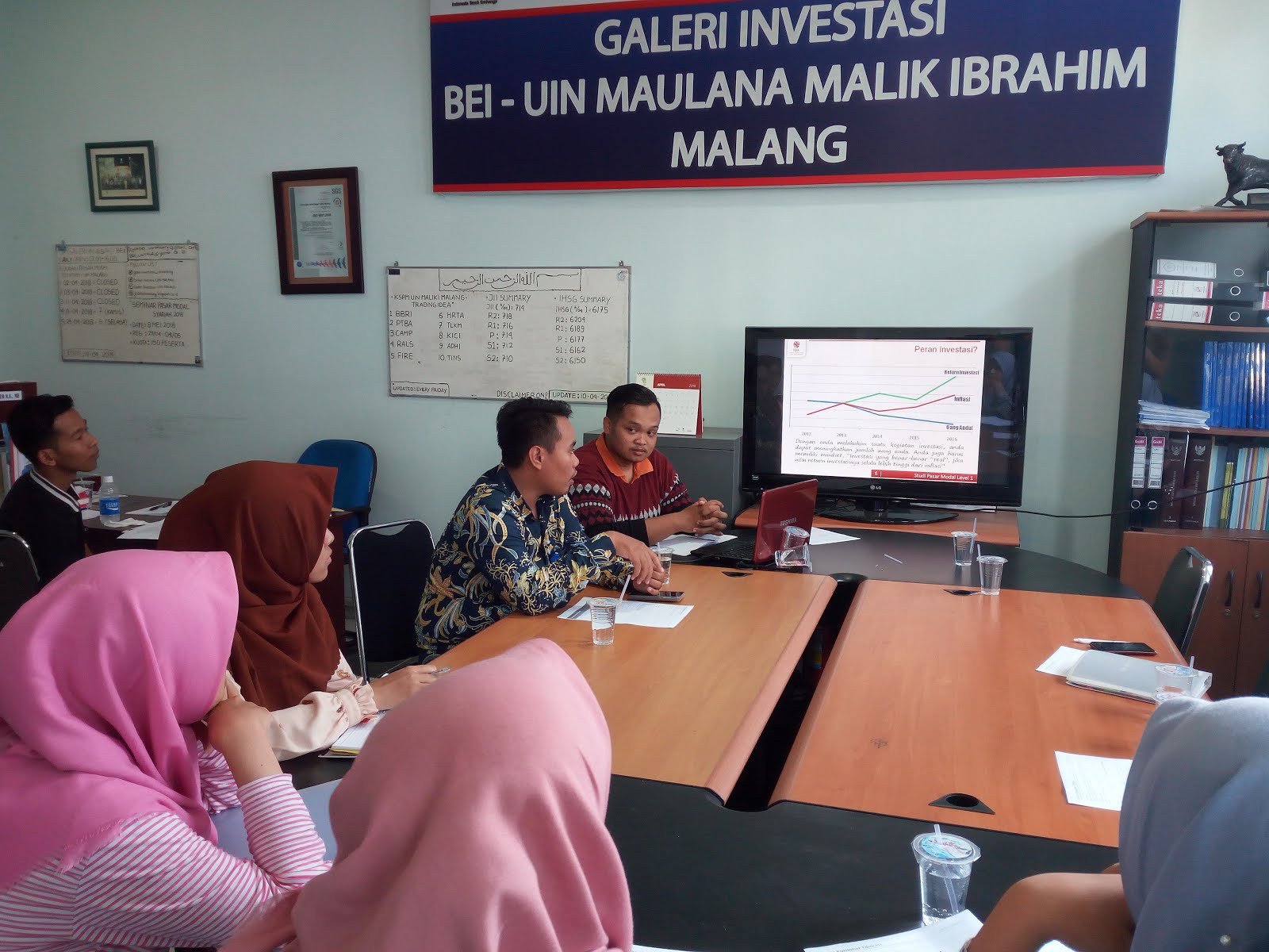 IHSG pada tanggal 11 April 2018 berhasil ditutup di angka 6.360, melanjutkan tren kenaikan sejak tanggal 05 April 2018. Berita baik ini pun membuat para mahasiswa dan mahasiswi UIN Maliki Malang tertarik untuk berinvestasi di Pasar Modal Indonesia. Galeri Investasi BEI – UIN Maulana Malik Ibrahim Malang sebagai salah satu Galeri Investasi dibawah naungan Bursa Efek Indonesia terus melakukan kegiatan sosialisasi dan edukasi pasar modal di kalangan mahasiswa, akademisi, dan masyarakat di sekitar Universitas Islam Negeri Maulana Malik Ibrahim Malang. Pada tanggal 11 April 2018, Galeri Investasi BEI – UIN Maliki Malang bekerjasama dengan Kelompok Studi Pasar Modal – UIN Malang dan Mirae Asset Sekuritas Malang mengadakan kelas Edukasi Pasar Modal 2018 – Batch 6. Edukasi Pasar Modal 2018 – Batch 6 dihadiri oleh 13 Peserta yang terdiri dari Direktur Galeri Investasi BEI – UIN Malang, 1 Asisten Galeri Investasi – UIN Malang, 2 Anggota KSPM – UIN Malang, 1 OE Staff dari Mirae Asset Sekuritas Cabang Malang dan 8 Mahasiswa UIN Maliki Malang. Para Peserta Edukasi Pasar Modal 2018 diberi penjelasan dan gambaran mengenai investasi yang nyata di Pasar Modal Indonesia melalui penyampaian materi lewat presentasi oleh Anggota KSPM – UIN Maliki Malang dan Perwakilan dari Mirae Asset Sekuritas Cabang Malang.